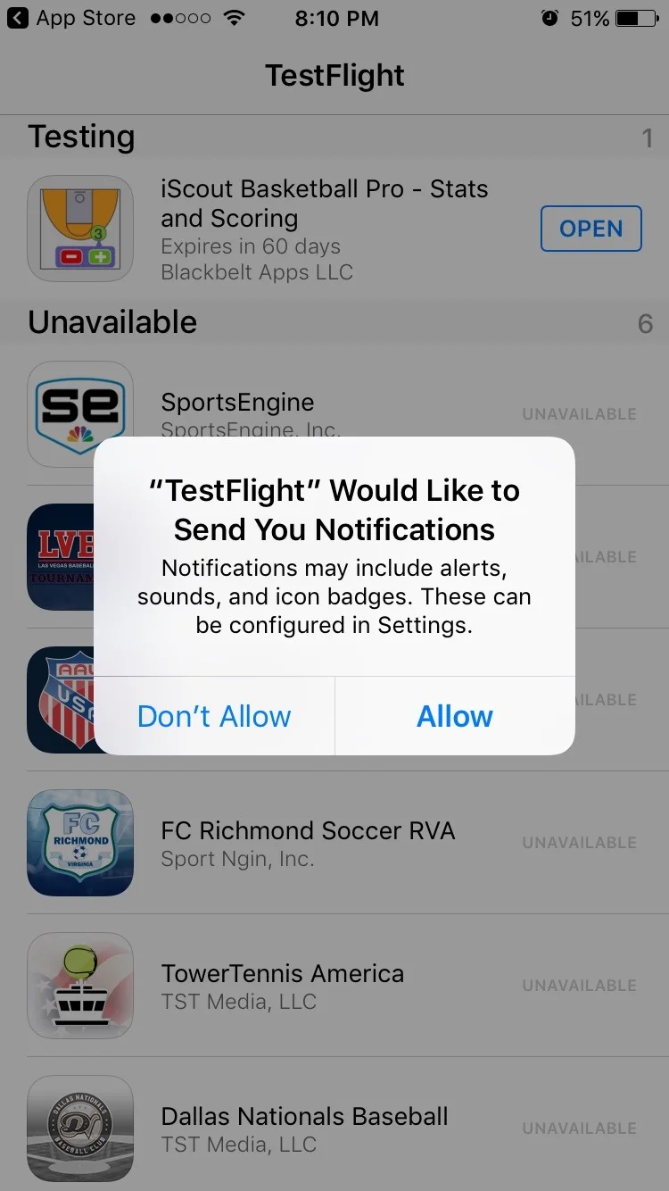 When asked, You should allow the test flight app to send notifications so you are aware of updates to the iScout Basketball beta app. The Install button will change to “Open” as shown below.
